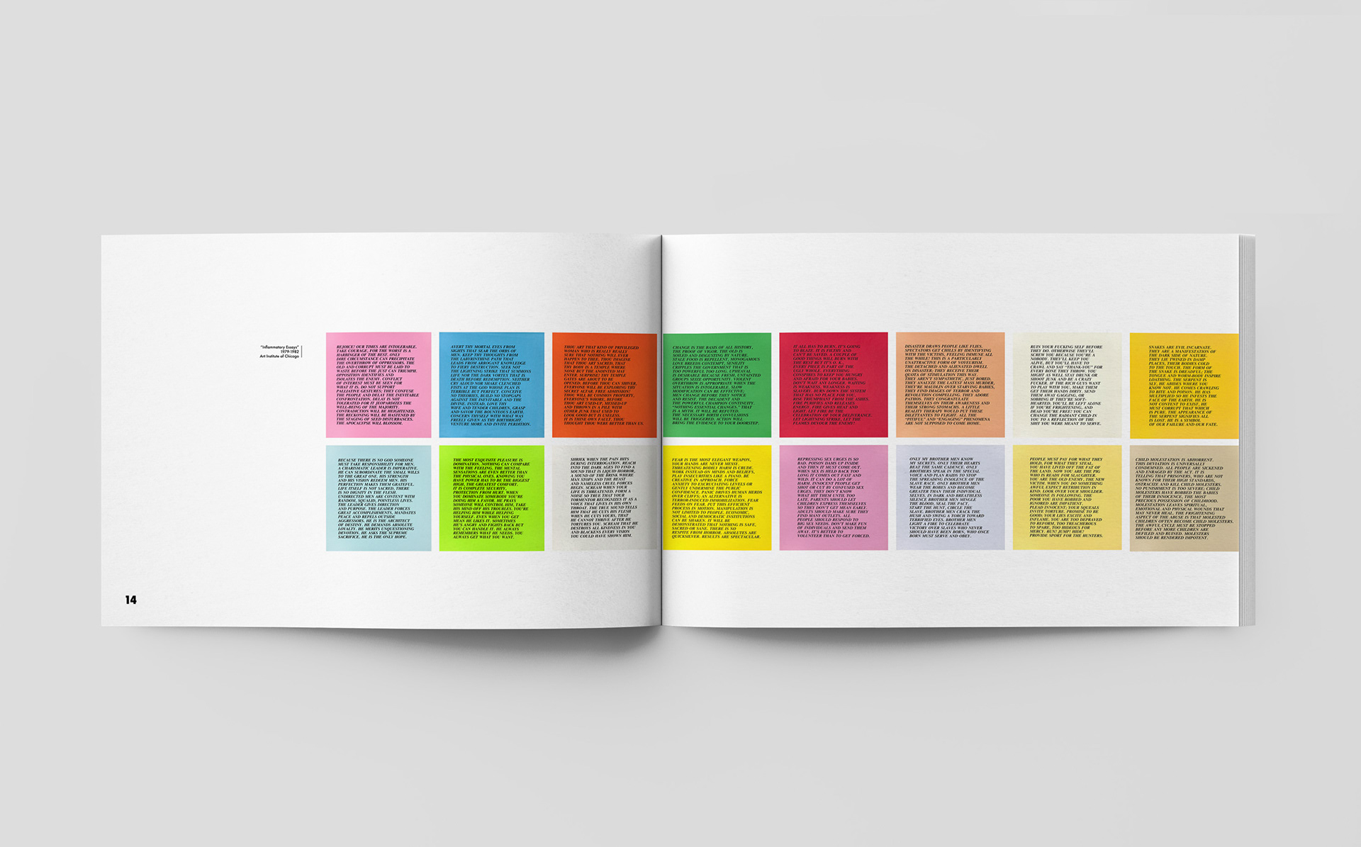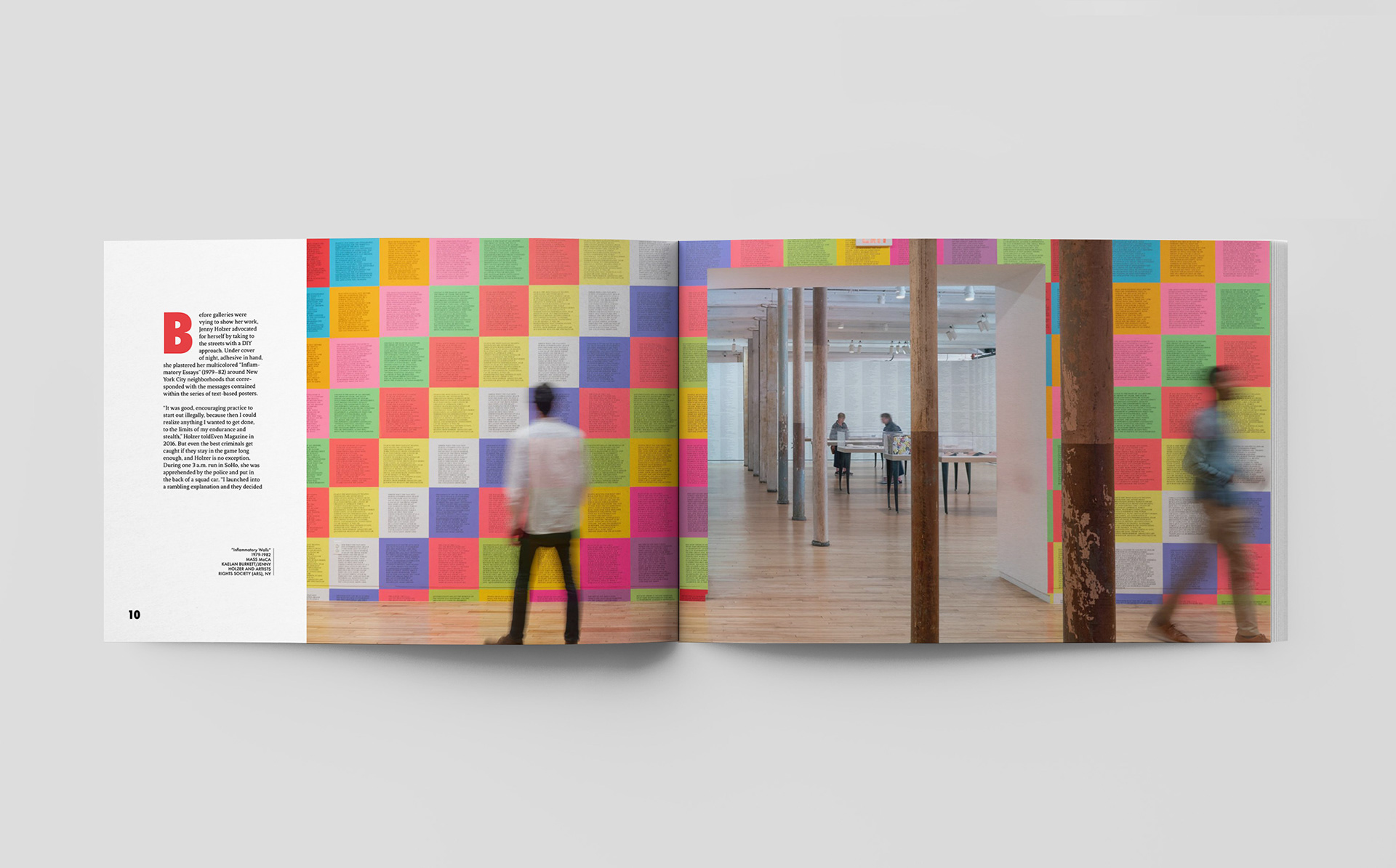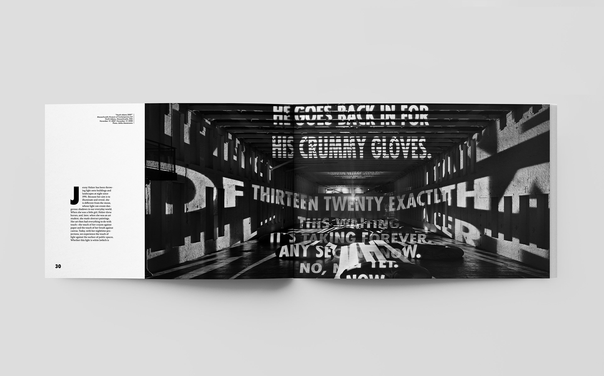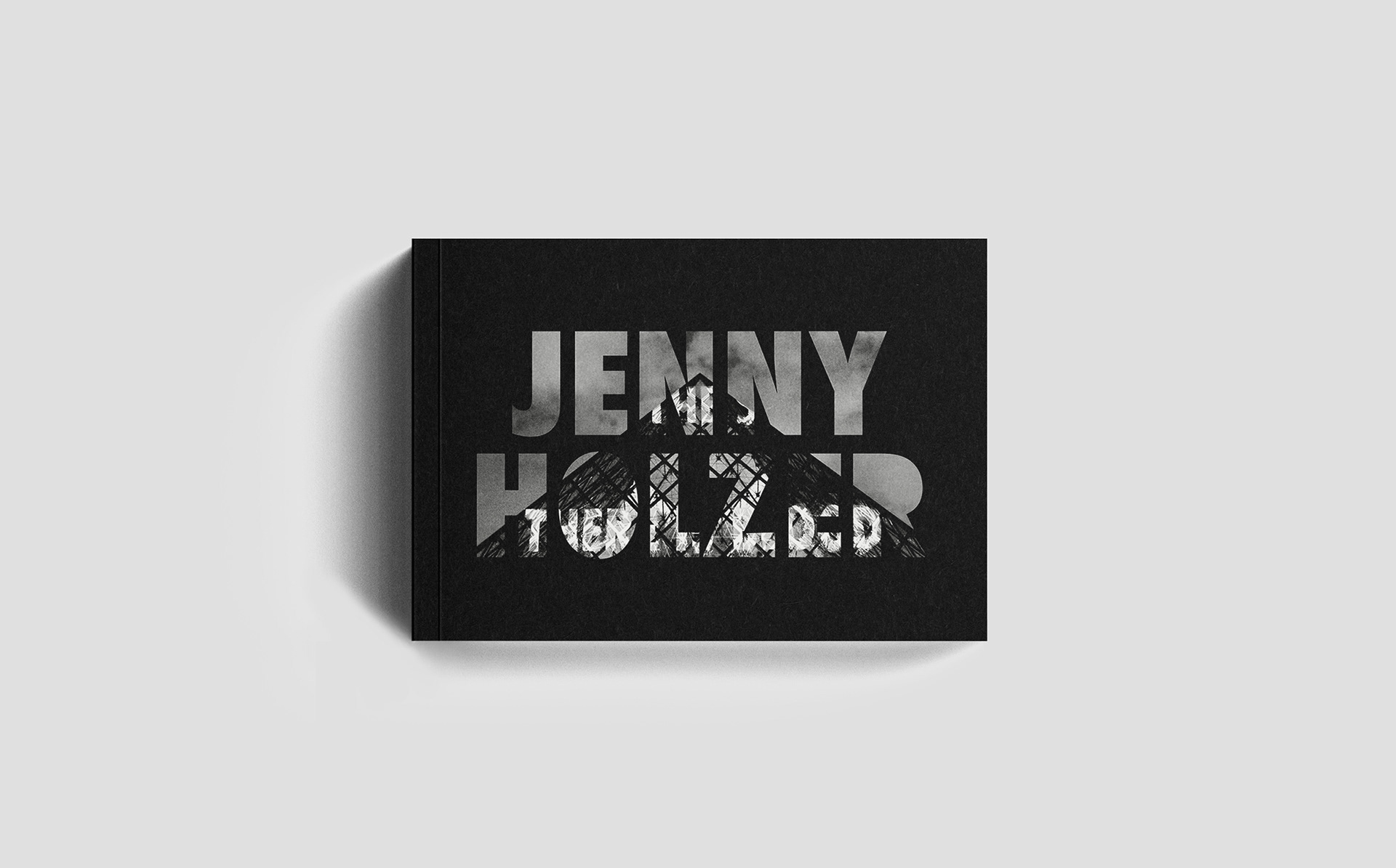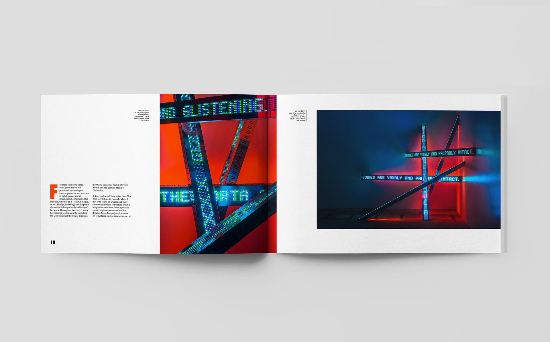 This catalog documents the works of Jenny Holzer, categorized into 3 of her most prominent mediums. A horizontal grid system allows the scale and presence of the photography to be communicated to the reader.